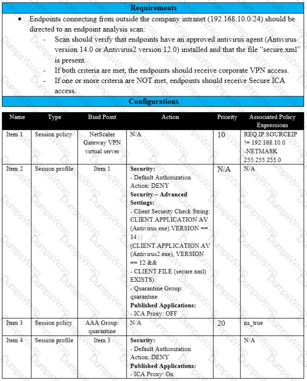 Scenario: A Citrix Architect needs to assess an existing on-premises NetScaler deployment which includes Advanced Endpoint Analysis scans. During a previous security audit, the team discovered that certain endpoint devices were able to perform unauthorized actions despite NOT meeting pre-established criteria.