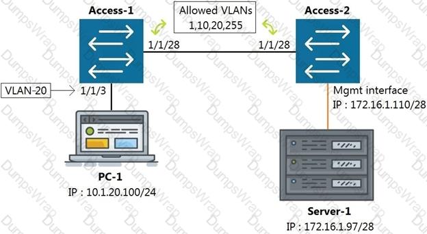 All switches are running Aruba OS-CX. While working in the terminal of Access-2, you are unable to reach Server-1 using SSH.