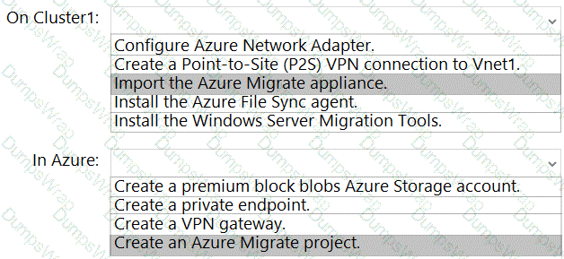 What should you do on Cluster1 and in Azure before you perform the migration? To answer, select the appropriate options in the answer area.