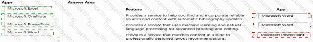 Which Microsoft 365 Apps apps should you use? To answer, drag. the appropriate apps to the correct features. Each app may be used once, more than once, or not at all. You may need to drag the split bar between panes or scroll to view content.