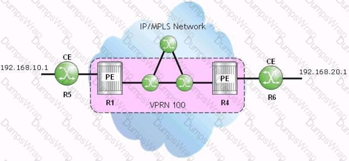The CEs use BGP and export policies to advertise their local prefixes with the VPRN on their PEs. If the VPRN is functioning properly, which of the following commands will succeed when performed on router R1?
